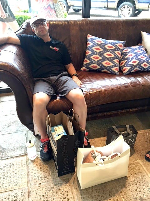 When we’re in town for a race, my hubby’s race activities first call for pre-shopping. Then, the day before the race, when he is feet up resting, it is full-on shopping. Finally on Saturday, during the out and back bike, I have time to head back for any items I forgot or had to think about before buying. It is a tough job and we have trained well, so we’ll make it to the finish line (ie: full suitcase). And, just to be fair, my wonderful triathlete came up with this shopping idea and honestly, it’s only a couple of hours each day, so we can all be together the rest of the time..
