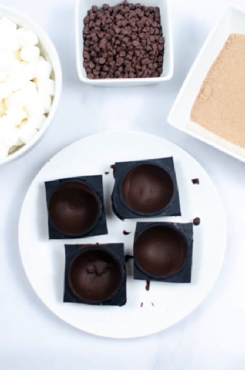 - Fill one half of the mold with your marshmallows and hot chocolate powder.