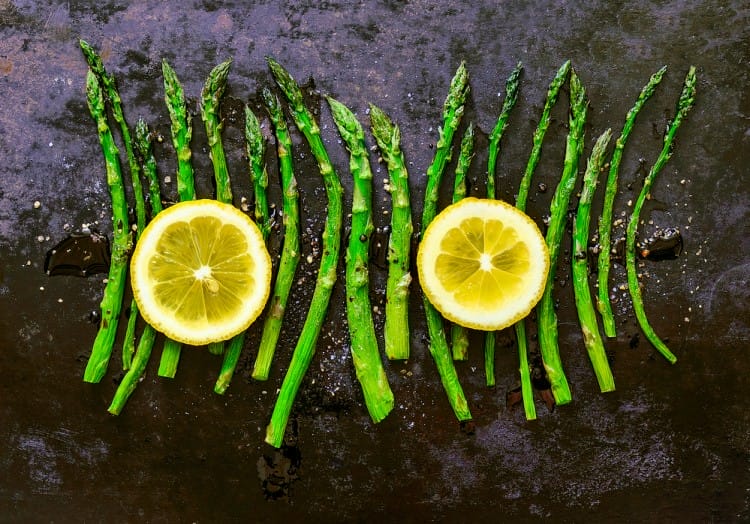 When the roasted asparagus comes out of the oven and is still warm, we like to give it a quick squeeze of lemon.