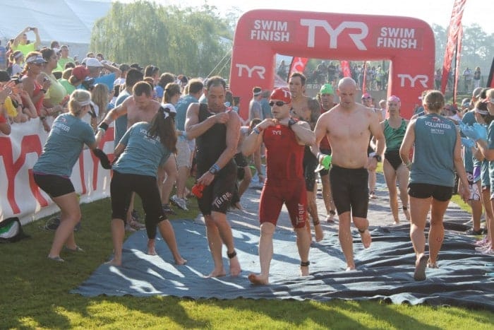 There is adequate field parking close to the swim start, but be prepared for traffic in and out of the area, especially as people start to exit after the swim and head to the T2/finish line venue for the rest of the race. We have heard that people who parked closer to the village got stuck until all the bikes were out, so seriously, if you need to drive to the start of the race, check this out beforehand. There are lots across the street from the finish line/expo area and we heard people also parked down the road at the Whole Foods.